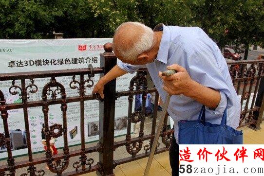 一位85岁老人在查看别墅材料,他觉得这套建筑挺独特的。