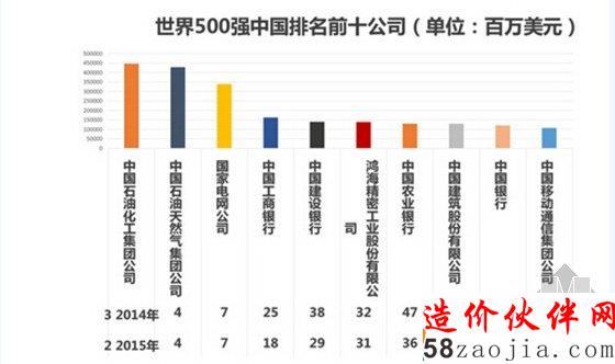 财富500强依据营业收入进行排名,因此中国排名最靠前的10家公司即中国营收最高的10家企业,柱状图代表的即是它们的营收,均折算为百万美元。