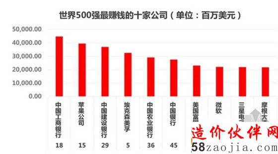 在以营收进行排名的世界500强中,我们挑选了利润最高的10家公司,其中四家来自中国,即国有四大银行。柱状图代表的即是它们的利润,均折算为百万美元。