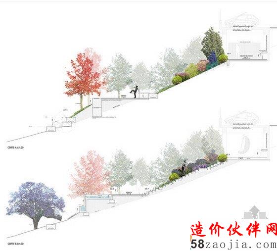 在池塘的两侧又是两个细长狭窄的小平台,平台地势结构平坦,位置高于地面,因此,这里非常适合建造一个草坪。南北边的平台上铺有一块块石头组成的框格,经常被当做河堤使用。烧烤区位于停车区的下方,这样,停车区便成为了烧烤区的“顶棚”。在草坪区和烧烤区中间是一片自然层级面,其实就是一个斜坡,坡道上种有各种灌木和五彩的花卉,植物的栽培有助于斜坡的稳固。为了将烧烤区和草坪区连接起来,设计团队在场地中央设置了一个不规则的阶梯,该阶梯是由预制混凝土制成的。但随着时间的推移,阶梯上也开始生长植物,或者草坪区的植延伸到了阶梯上,两个区域逐渐成为了一个整体。