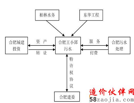 项目采用TOT(转让-运营-移交)模式,通过国际公开招标转让王小郢污水厂资产权益。市建委与项目公司签署《特许权协议》,代表市政府授予项目公司污水处理厂的特许经营权,特许期限23年;合肥城建投公司与项目公司签署《资产转让协议》,落实项目转让款的支付和资产移交事宜;市污水处理管理处与项目公司签署《污水处理服务协议》,结算水费并进行监管。特许经营期(23年)内,项目公司提供达标的污水处理服务,向政府收取污水处理费。特许经营期结束后,项目公司将该污水厂内设施完好、无偿移交给合肥市政府指定单位。