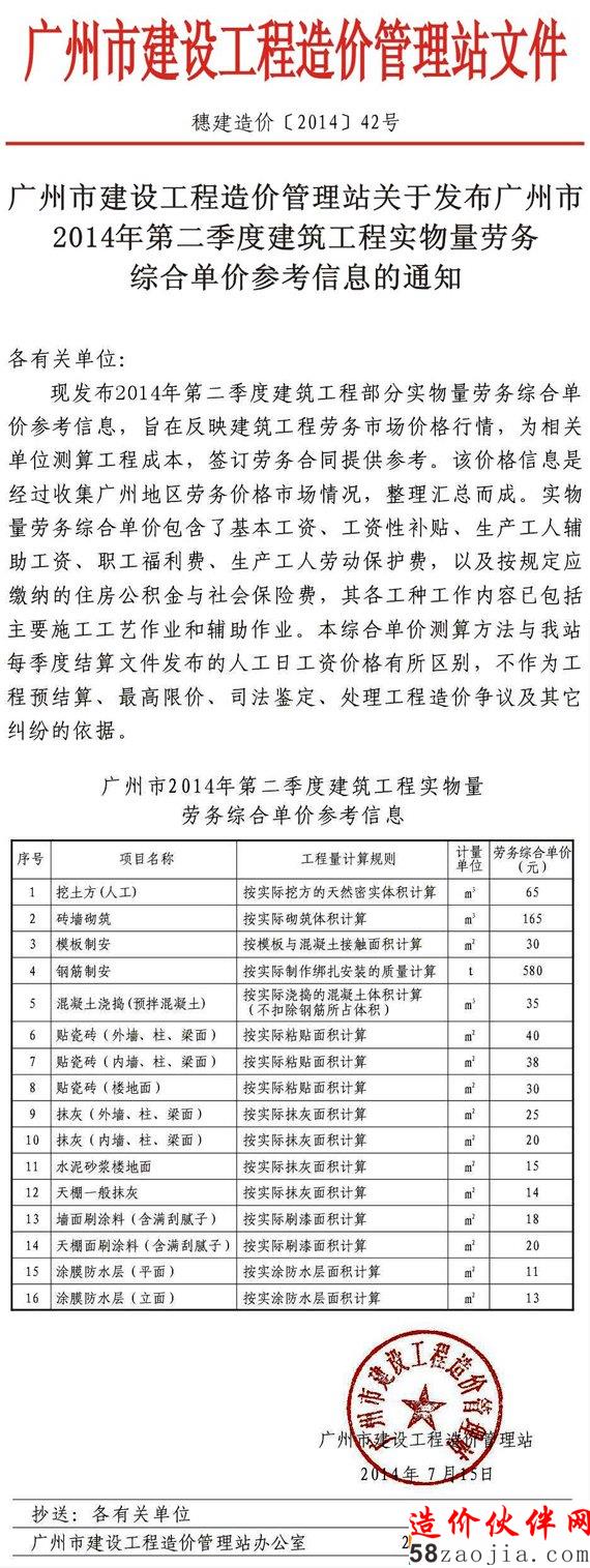 [广州]2014二季度工程实物量劳务综合单价信息