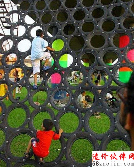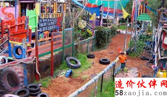 这个游乐场是由一辆废弃的老火车改造而成,使用废弃和回收的材料建造,呈现出一个丰富多彩的游乐场,如用废弃材料制成马匹造型的秋千以及用轮胎做成的攀爬牆和滑道。