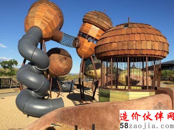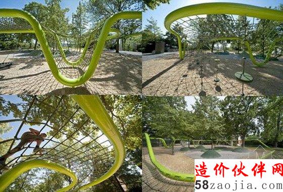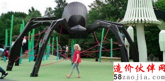 这个公园里的游乐场有巨大的蜘蛛、蛛网和蘑菇,小朋友可以在里面爬绳网、玩滑梯。