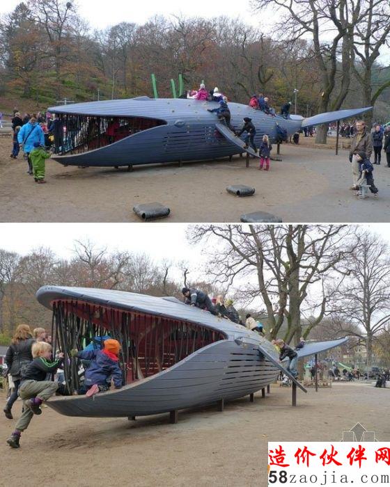 这是一个巨大的蓝鲸,尾巴可以爬,中间可以坐滑梯,而鱼嘴这里是海草丛林。