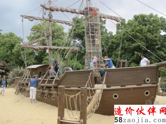 木质海盗船做主体,周围还有城堡、喷泉,以及给家长设的咖啡座。