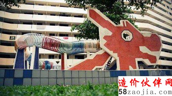像这种有着沙操场和大型动物砖墙的游乐场曾经在新加坡很流行,但现在都已经被拆除,换成了更为安全的形式。而这个20世纪70年代的五彩巨龙,是为数不多被保留下来的老式公园之一,孩子们可以在巨龙的身体上盘绕着爬坡。