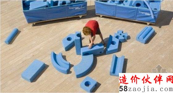 这个游乐场有许多蓝色泡沫块,孩子们可以自己建造游乐场。这里没有传统游乐场上固定的游乐装置,鼓励孩子们通过开放式和自由形态的游乐装置体验其中的乐趣。