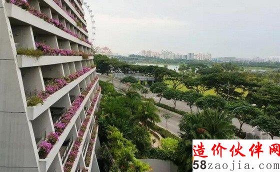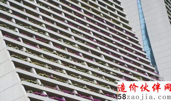金沙酒店采用的是最简单的外墙垂直绿化形式:即挂盆+悬垂植物。阳台外成排种植不同颜色的叶子花,但在设计上将植物构成简洁流畅的线条,丰富了建筑立面景观。