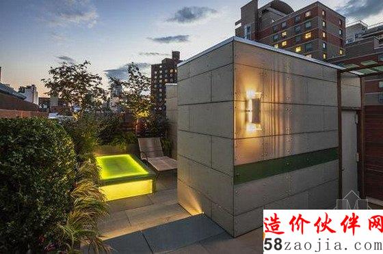EvanLaiLandscapeDesign事务所被邀请为纽约市一个多沙的东村市镇房屋上建造一个屋顶花园。客户是斯堪的纳维亚人的后裔,正在寻找不会损害功能性的精致花园。这个花园利用石头框出边界,表面抹上水泥,但绿色的树脂板将其带入生活中。