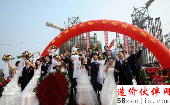 据介绍,中建五局广西分公司为像祝强一样奋斗在工地一线的11名员工举行集体婚礼。11名新郎都是工地上的建设者,平时都是奋斗在建设的第一线。南湖隧道工程作为南宁市的重点工程,地处南湖公园园区,地理位置相当特殊,而且工期非常紧张,为了确保工程优质高效安全的如期完工,包括这11名新郎在内的中建五局的建设者日夜奋斗在工地上。这11名新郎为了工程建设推迟了婚期。“前天,这些新郎还在工地上奋斗呢!”中建五局广西分公司工会主席舒燕说。