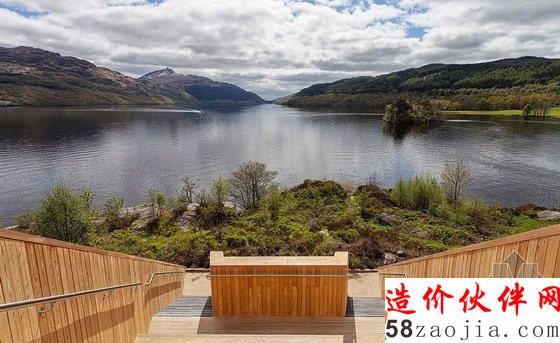 罗蒙湖上还有各式各样的岛屿和半岛。最近,其中一座半岛上建起了一个漂亮的观景台。观景台就在湖边,一般通过沿湖西岸修建的 A82 号公路或行船抵达这里。从路边停车场沿着一条弯曲又有些倾斜的路走到半岛最高处就到了,在你眼前的将是辽阔的湖泊和崇山峻岭。朝向湖泊走时,观景台看起来十分瘦长,门和通道甚至也和那条斜坡上的路一样狭窄。但从背面看,那扇小小的门就像照相机的镜头,透过它看到的湖景,与整个全景形成有趣的对比和呼应。