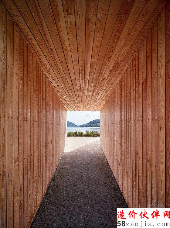 穿过狭长的通道走出去,有种豁然开朗的感觉——如果有机会的话你可以到体育场的球员入场通道试试,前方是一大块明亮的开阔地,身后则有高高的阶梯式座椅。也正是来到面对罗蒙湖这一侧,你才能真正看清观景台的模样。如其名字“金字塔”,观景台为三角形,温暖的木结构,中间是那条通道,人们可以通过两边有些陡的楼梯走到台上。然后站在上面欣赏这里大气而美丽的自然风光。