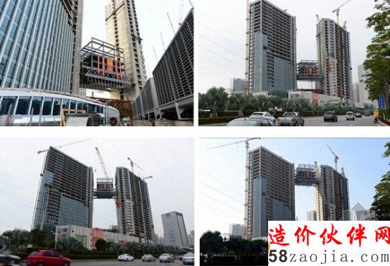 据悉,本次成功提升对接的钢结构连廊横跨于南塔楼和北塔楼的26-30层,连廊跨度为41m,总重量达1280吨,整体提升高度为114.1m。安装高度高、构件重、吊装作业半径大是吊装施工的重点和难点,工程的特殊性给机械设备的选型布置、操作架体的布置、安全防护等都增加了很大的难度,采取常规的钢结构吊装方法难以实现。此次提升是国内运用液压整体提升技术单次提升连廊难度最高的工程之一,也是省内首例高空重型钢连廊吊装。