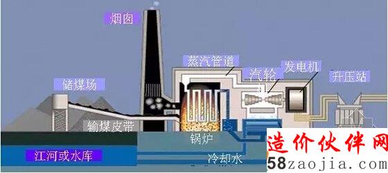 火电厂有四大设备,锅炉,汽轮机,给水泵,发电机。给水泵将给水增压送入锅炉,水在锅炉内吸收煤炭燃烧释放的热量进而蒸发为水蒸气,之后水蒸气继续受热成为高温高压的过热蒸汽,称为主蒸汽或新蒸汽,主蒸汽再由管道送入汽轮机中,在汽轮机内膨胀做功,使汽轮机以3000rpm的速度旋转,水蒸气从汽轮机排出后压力很低,称为乏汽,乏汽被送到凝汽器中被循环水冷却凝结再由给水泵送入锅炉如此循环。这个简单的循环称为郎肯循环。汽轮机的主轴与发电机是连接在一起的,汽轮机旋转同时带动发电机,产生电能。