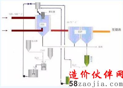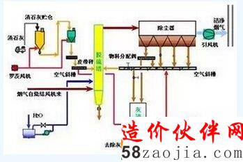 从锅炉出来的含有粉尘和SO2的烟气,从脱硫塔的底部经过文丘里管上升,进入塔内。生石灰在消化器内加水消化后,在消石灰仓储存。将一定量的消石灰粉和水在文丘里喉口上端加入,在脱硫塔内与烟气混合流动,并与烟气中的SO2反应,生成亚硫酸钙和硫酸钙。携带反应产物和煤灰的烟气冷却到稍高于露点以上的温度,进入后面的布袋除尘器。反应产物和煤灰被除尘器处理后,通过空气斜槽返回塔内,再次循环参与脱硫反应。在垃圾焚烧炉烟气净化中,在除尘器前加入活性炭末,通过多次循环,以达到脱除重金属、二噁英的效果,脱硫灰通过仓泵输灰至灰仓外排。由于消石灰、煤灰和反应产物多次在脱硫塔和除尘器之间循环,增加了反应时间,消石灰的作用得以充分发挥,用量减少,同时脱硫效率得以提高。