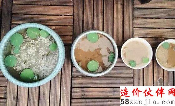 ▲买的碗莲种子泡了一个星期全散叶了,然后放到盆里,但是一个盆只能养一颗,不能太贪心,放几颗一个盆,会死掉不少。