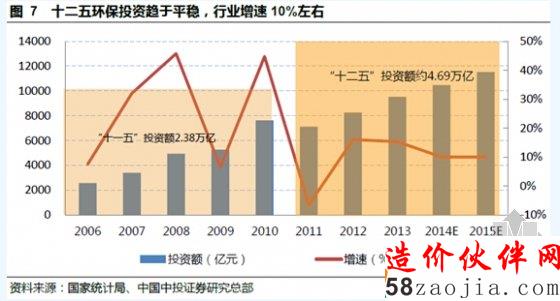 根据统计,“十一五”期间环保投资总额约为2.38万亿,但是,每年行业增速波动较大,而“十二五“期间,环保投资总额约为4.69万亿,每年增速稳定在10%左右。我们认为,环保投资在“十二五”期间已经进入平稳增长的阶段,“十三五”期间行业有望加速增长。据环保部和国务院口径,我国环保投资在”十三五“期间有望达到8~10万亿,我们以此推算,行业增速有望维持在15%~20%。