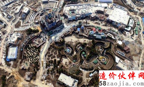 上海市,无人机航拍上海迪士尼乐园在建工地,奇幻城堡露出真容,游乐设备陆续进场。