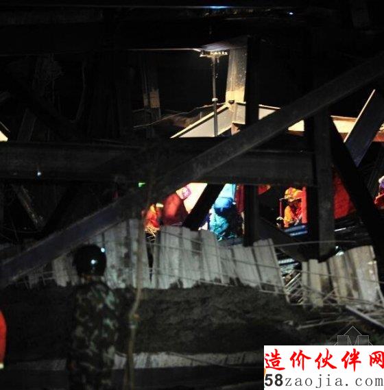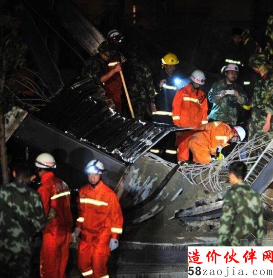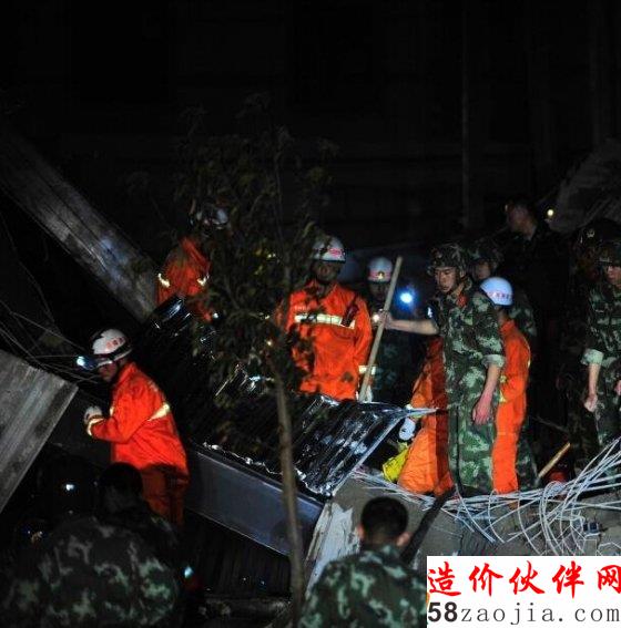 事故现场已经停电,记者借助救援的灯光看到,大批的救援人员和搜救犬正在一片废墟上紧急搜救被困人员。