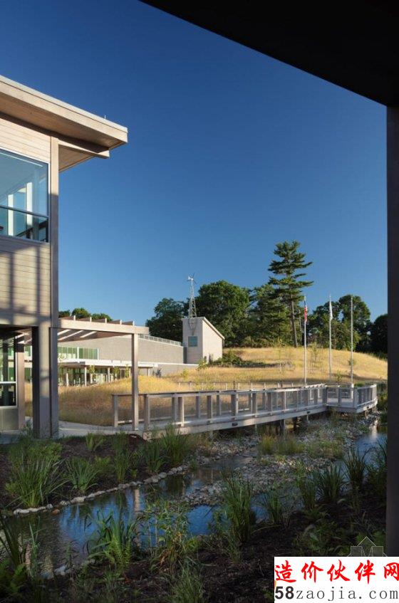 整个小学拥有四个教育示范的环保板块:覆盖率达到50%以上的屋顶花园;有码头能观察到雨水自然过滤过程的雨水花园;一个埋在地下的,对雨水径流进行进行存储再用于植物灌溉的水处理系统;展示“生态能源”自给自足的风力发电机。