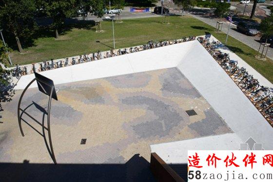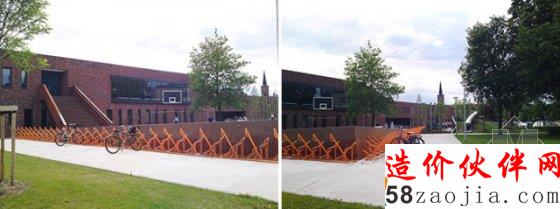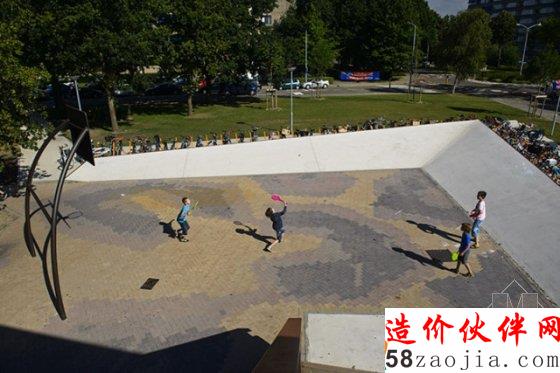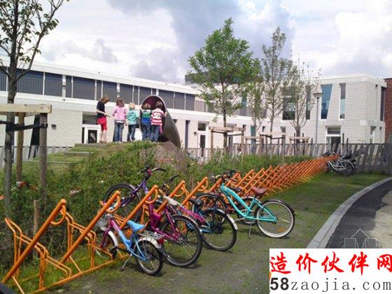 设计师尽可能的为孩子们划定出完整的休闲区域,比如他们将场地的边缘抬高,塑造出碗型的活动空间。碗型空间的背后则是大量的自行车停车位。受用地限制,儿童活动场地只能呈点状分布在用地之中,为此每一个场地都采用围栏保持其完整性。