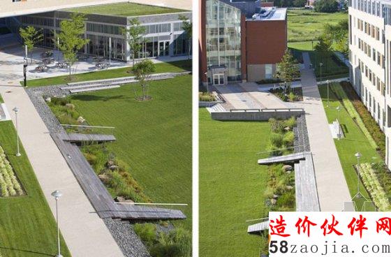 校园内这部分的开放空间非常小,校方希望建立传统的校园发展模式。因此,将“Z形”的建筑大厅改造成两个新的大院,由一个2层楼高的大门连接,面朝南部沼泽湿地。园区设计沿着一条连接庭院和沼泽的中心街道展开。之前很少使用的车辆下坡段被移除,打造成为北方四合院“绿色庭园”,可以作为聚会空间和通往大厅和食堂的主要通道。园区曾经的工业地形被保留,添加了长形板状靠墙混凝土座位,指引行人大楼入口的方向。南部“沼泽庭院”由一个倾斜的绿地休闲广场和一个180英尺长的生态草沟组成,收集园区的雨水,并汇集流向湿地。可以俯瞰到一期两条走廊一直延伸到沼泽的边缘 。