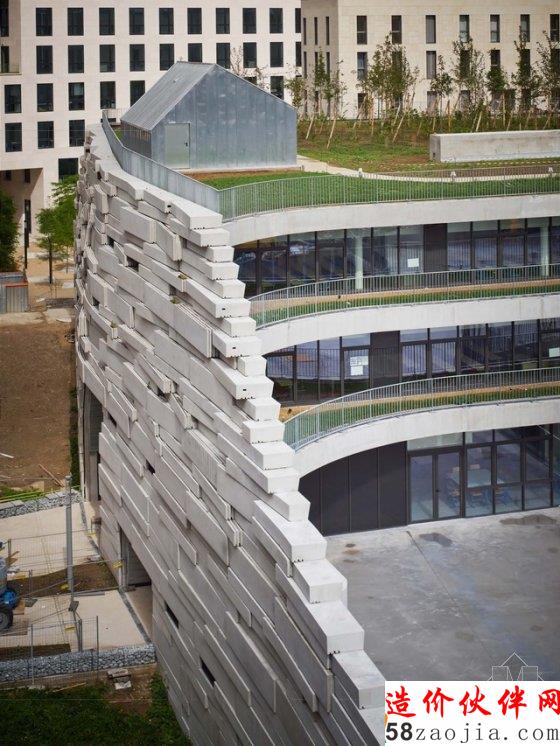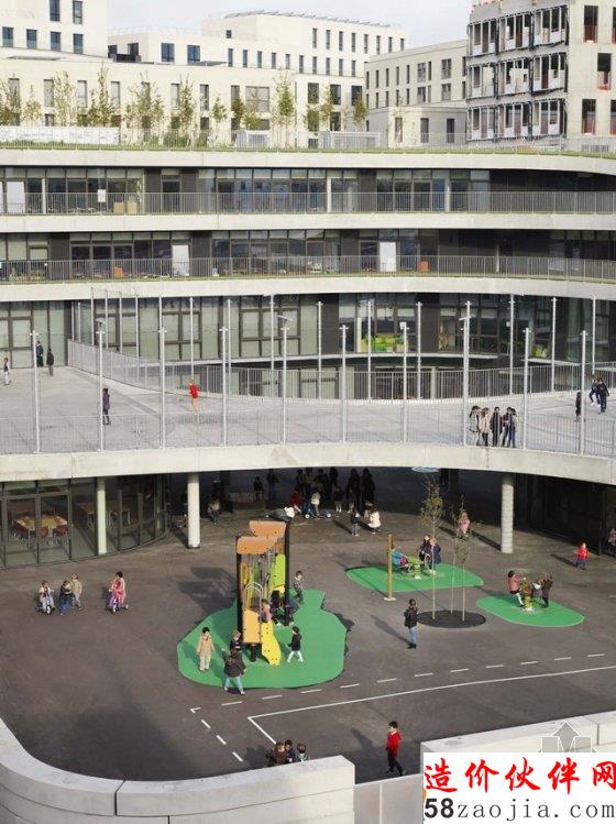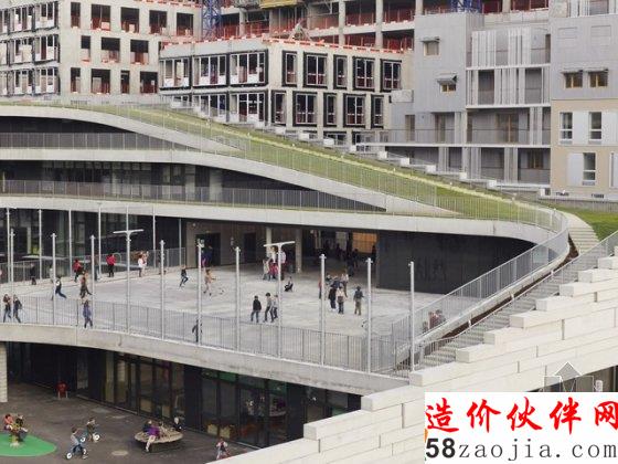 这是一座位于法国布洛涅-比扬古(Boulogne-Billancourt)的中学,建筑看上去更像一个游乐场。项目由一个18班教室的中学及一个面向城市的体育馆组成,由于场地的局限性,建筑师将学校所需的绿化景观放到了屋顶及露台上,产生了犹如梯田式的景观效果。