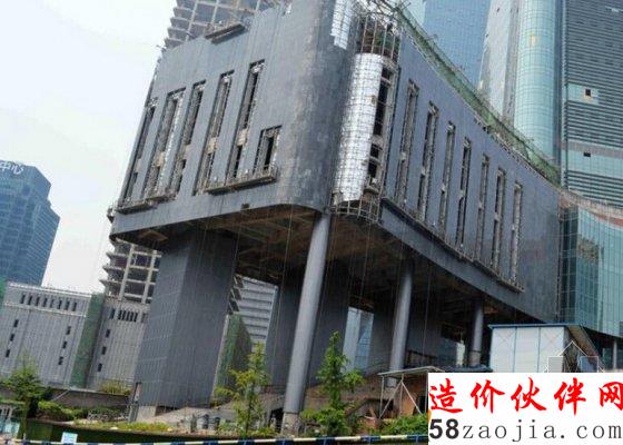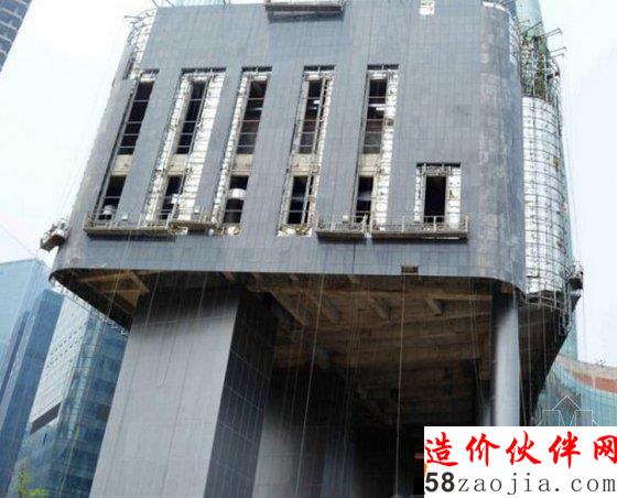 重庆江北嘴,一座在建高楼的裙楼造型奇特,一边的支撑柱子很细,被市民称为“最牛假肢楼”。