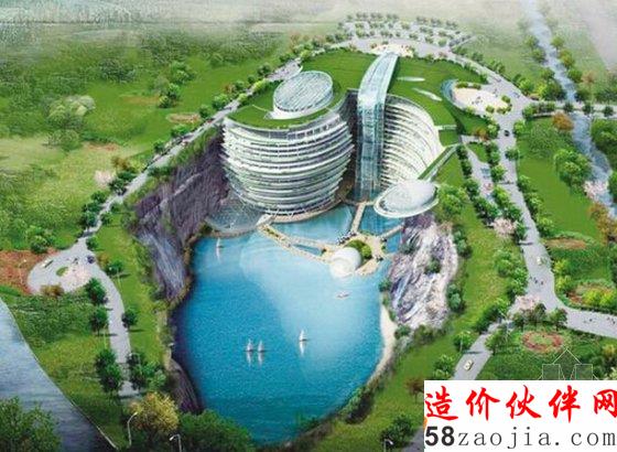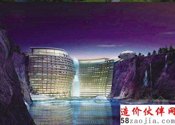 “深坑酒店”选址在旧矿场形成的深坑,由迪拜帆船酒店原班设计人马——阿特金斯团队担任建筑设计,包括地上两层、地下17层和水下两层,是世界上首个建设于坑内的五星级酒店。整个项目投资上百亿,是天然室内花园、大型景观瀑布、景观总统房、水中情景房等合为一体的现代化特色建筑。