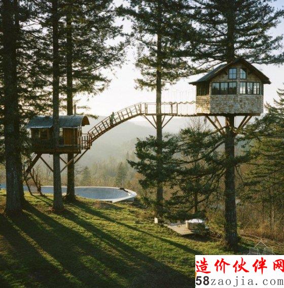 福斯特在2014年萌生打造树屋的想法,于是他召集朋友,决定将这想法付诸实践。他表示,一开始没有打造树屋的全盘计划,都是一边建树屋,一边完善,逐步解决出现的各种问题,他很享受这种过程。最终,他使用道格拉斯冷杉和西部红雪松,成功地打造了两个奇妙树屋,这两座树屋的面积均小于200平方英尺(约18.6米),分别高出地面20英尺(约6米)和30英尺(约9米),中间通过悬吊的索桥连接。