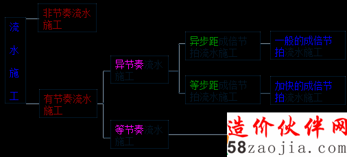 有节奏流水施工是指在组织流水施工时,每一个施工过程在各个施工段上的流水节拍都各自相等的流水施工,它分为等节奏流水施工和异节奏流水施工。
