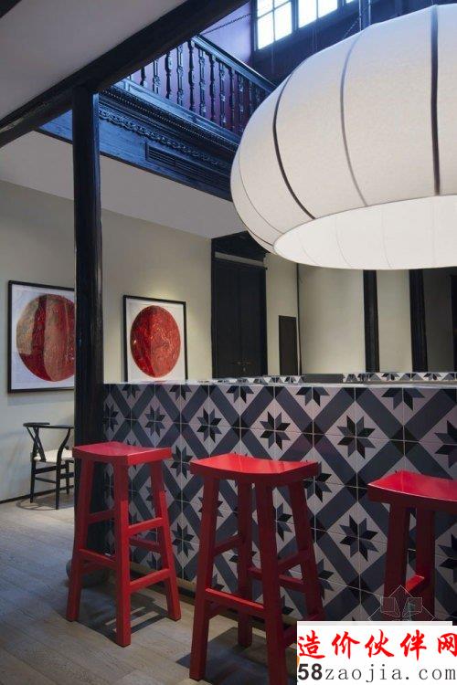 除了保留和恢复其中式的特点,来自法国喜爱将中法文化结合在一起的 Thomas Dariel 也将中西融合在这个室内设计中的表现的淋漓尽致。代表惊蛰节气的阅读室里,配以一个西式壁炉和小型钢琴,不但在中式的氛围中更添一份温暖,更让人有种置身于法国文艺复兴时期的感觉,如此取长补短的结合真是恰到好处。中西餐厅的强烈色彩对比,巨大的悬式吊灯,以及那引人注目的法式花饰瓷砖砌成的吧台让人在一片传统中找到新鲜亮眼之处。