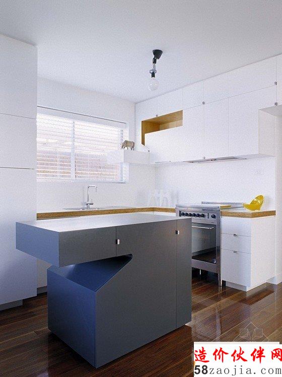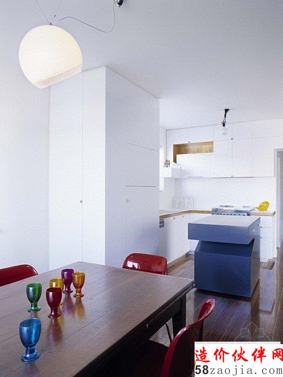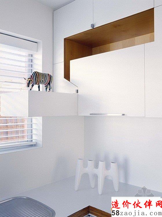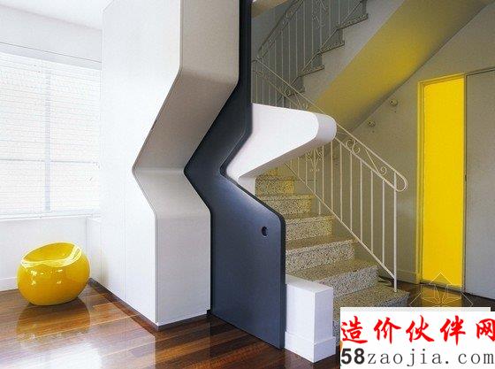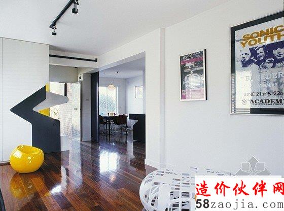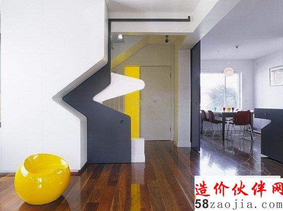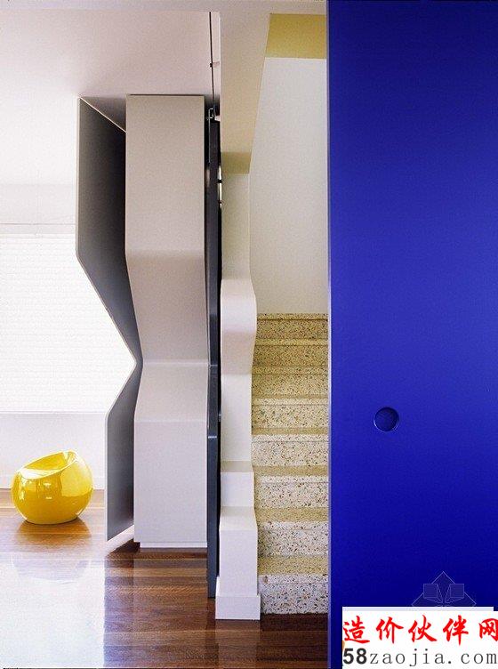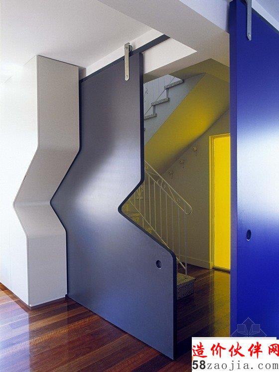 房间原本结构坚固简单又朴素,设计师在现存结构表层又多加了一层结构,使房间内主要空间能相互联系,更具有细节感。搁物架位于高处,形成有效的储藏空间,滑动门混淆了内外分界,门廊上方的橱柜和台阶形成不对称效果。住宅只有两层,是砖砌结构,新旧部分充分结合,突出了其特点。