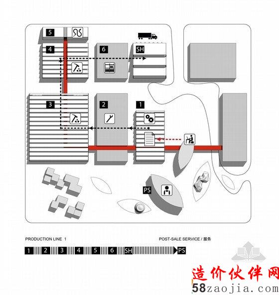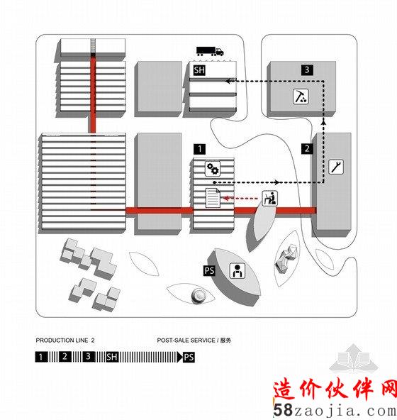 项目构成: 总面积117,500m2: 包括设计室、办公室、车间、工厂、物流及员工宿舍