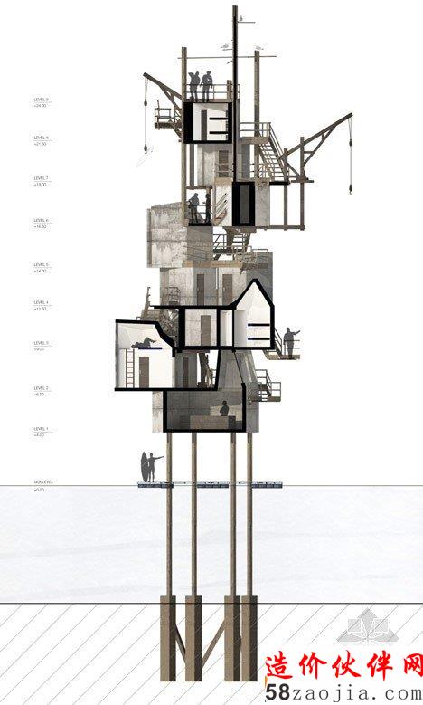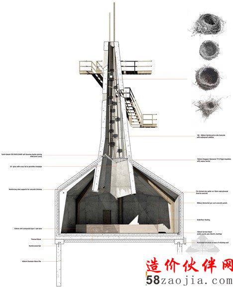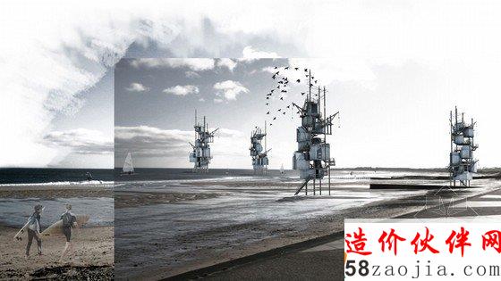 Savage介绍说:“这个设计会成为一个临时的、不断变化的鸟类博物馆,我发现这里有一个鸟类协会和一个水上活动社团,他们在不同的季节特别活跃。而我意识到我可以把这两者结合起来做出些什么。”他提出在海边沙滩上建一系列的九层高的建筑,有钢管脚手架和其上的混凝土小屋构成。在夏天和秋天,作为水上运动者的营地,供他们准备食物和存放装备;而冬天和春天,这里就成了鸟类的庇护所。鸟类可以通过建筑屋顶隧道状的开口,进入建筑内;鸟类观察者们可以在周围的楼梯和平台上观察它们。附近的岸上还会有一个游客中心。