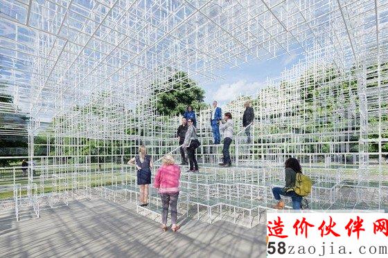 建筑师藤本壮介介绍说:“我为2013年的蛇形画廊设计了一个建筑景观:一个透明的平台,鼓励人们与之互动,以不同的方式来探索这个场地。在田园般的kensington公园中,我想象着生机勃勃的绿色植物围绕着这个几何形式的建筑物。一种全新空间形式将被创造出来,自然与人造物相互融合;不是单纯的建筑物,也不是单纯的自然,而是一个独特的、两者合一的空间环境。这将是一座精致优雅的画廊,三维网格结构由纤细的钢管构成。它是一个半透明的、不规则的圆环,同时还能为参观者提供一定的遮蔽,而又有一部分与自然景观相连接。建筑占地面积约为350平方米,共有两个入口。一系列台阶式平台提供了座椅休闲区,让这座场馆成为一个灵活的,多功能的公共空间。半透明的设计加强了建筑精细的质感,建筑师将创造一个几何形的、云状的建筑,它就像从连绵的公园景观中升起的一股薄雾。从某些特定视角观看,建筑和悬浮在空间中的参观者,好像与经典的蛇形画廊建筑融合到一起。”