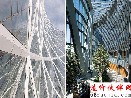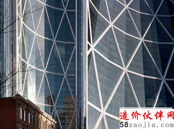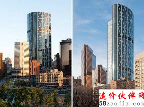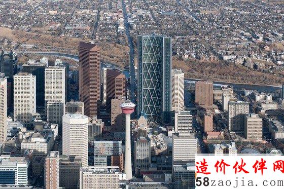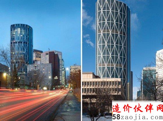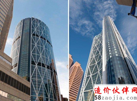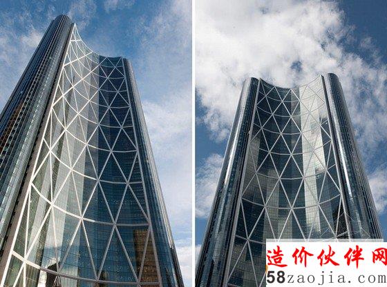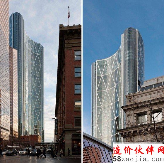 事务所高级合伙人Nigel Dancey介绍说,这栋高楼的形态来自卡尔加里独特的气候条件。建筑坐北朝南,有六层高的空中花园、咖啡厅和会议区,营造出舒适的办公空间。在建筑底层部分,有15条封闭的桥连接到市中心的商店、咖啡馆和广场,与城市活动相渗透。这个建筑的每个方面,包括架空的楼层和斜肋网格,都设计得十分高效。建成后,这个弓形写字楼就成了卡尔加里市新的象征。