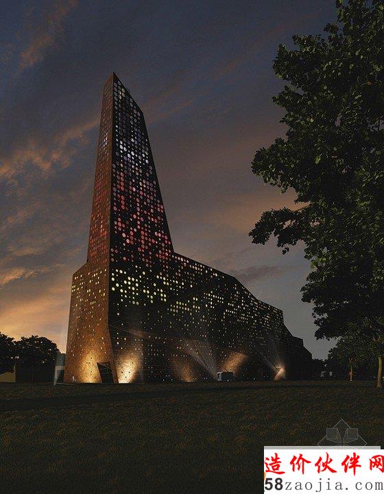 建筑外表是深茶色铝幕墙,由激光切割出的圆形开口。大楼主要有两层:内部一层首先保证了日光进入和空气流通,这样外面一层可以更加灵活。Van Egeraatto介绍他的设计时说:“夜晚时分,建筑里焚化炉投出的光芒像是灯塔一样,象征这里源源不断产生着能源。每个小时,都会有一点星火渐渐亮成火苗,照亮整个建筑,当这所谓的火熄灭,建筑重归燃烧余烬的黑暗。” 设计师希望他的设计能为这个纯工业建筑增加一些独特的附带价值。事实上,它确实丰富了这座丹麦小城的景观,低点的部分象征着周围的工厂,而高达200米的尖顶则与附近历史悠久的Roskilde大教堂相呼应。尖顶主要使用了暖色调的石材和砖材,与教堂一起成为了这个城市新的守护者。这个焚烧厂收集九个城市的废物,为整个Roskilde地区提供电力和热力能源。