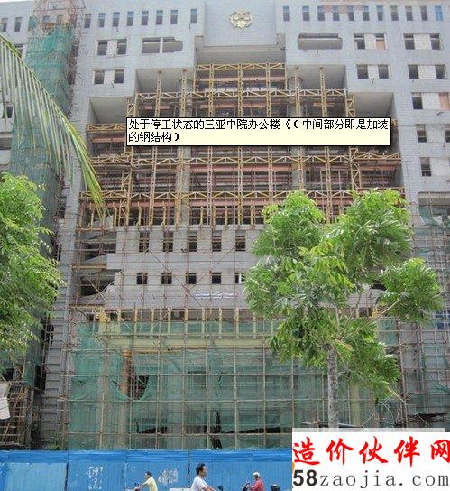 处于停工状态的三亚中院办公楼(中间部分即是加装的钢结构)