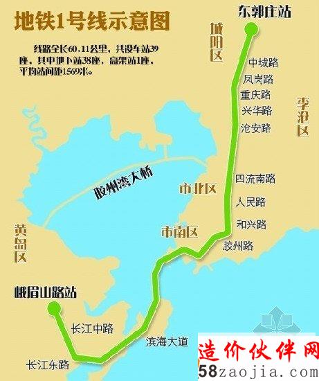 据了解,今年5月21日,环保部门对地铁1号线启动首次环评。环评公告显示,地铁1号线起自黄岛峨眉山路与长江路交叉口,沿长江中路、长江东路、滨海大道、跨海向北进入青岛主城区,线路进入主城区后沿费县路向东左转穿过青岛火车站广场,沿即墨路北侧、胶州路、和兴路、人民路、四流南路、胶济铁路东侧、沧安路、兴华路、重庆路、凤岗路、中城路、209省道至东郭庄(S209和青新高速交叉处西南处)。线路全长60.11公里,共设车站39座,其中地下站38座,高架站1座,平均站间距1569米。