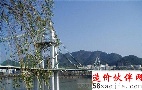 黄山世纪广场观光索桥是跨越新安江上的一座人行悬索桥,南起黄山学校,北至屯溪世纪广场,桥梁总长为290米。