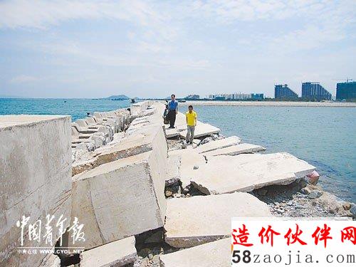 如此的偷工减料让防波堤在海浪面前不堪一击。中国青年报记者看到,防波堤的两个堤头均已坍塌损毁,防波堤内侧护面大段大段地被海浪掏空,如不修缮,500米长的防波堤用不了多久就将被海浪冲垮,沉入海底。