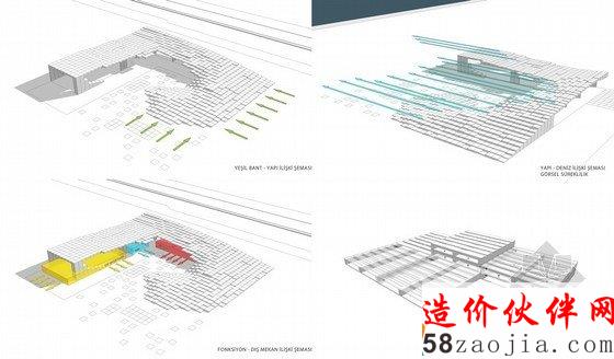 位于伊斯坦布尔的临近,Caddebostan和Pendik海岸之间,这不是一个为专业艺术家设计的建筑,而是一个为所有热爱艺术的人建设的建筑。在这里人们可以来自不同的社会和传统中不同的阶层,通过艺术和文化来分享他们的人生经历。整座建筑秉承的可持续发展的概念和循环利用材料,在整座建筑中,重复使用的木质平台,是整个设计的核心。它作为一个整体填充了空间的每一面。建筑也是一种文化,就是可以改变或者说可以成为一个可变化的区域,可回收的材料--木质平台,一块有特定维度的模块,试图和整个建筑在整体上搭配和谐。该项目在建筑构造上采用的建筑内部可回收的木质材料,它创造了一个表面,日光可以在这里进行漫反射,更加方便自然日光的进入。上面建筑的动态运动设计也在室内空间得到应用。社会文化中心的主要思想就是通过一个简单的可回收材料和可持续发展的建筑方法将文化思想的积淀转化为建筑积淀,为整体建筑营造一个和谐的氛围。