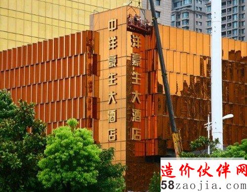 从该建筑招牌和宣传广告看,是一家(白金五星级)酒店,店名为“中洋豪生大酒店”,该酒店总面积12万平方米,主楼48层,高200米,总投资15亿元。不但内设各种豪华配套设施,在楼顶还建有直升机停机坪。