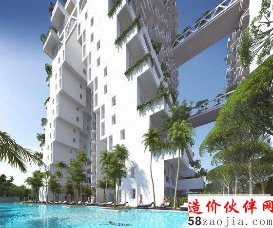 设计师对这个建筑的设计,主要是让居民共享建筑立面的公共设施,包括地面上的游泳池,建筑中的花园式通道,以及屋顶露台和花园等。这个住宅不是传统意义上单纯的的塔楼,天空栖息地创造了一种奇异的梯田式公寓。它看上去就像是梯田一样往上叠加似的,整体又是多孔和开放式结构,以吸收更多的阳光,让空气自由流动,连接建筑的通道被设计成花园,让人们最大限度地享受社区的优质环境。该建筑相比传统住宅建筑,材料更加细腻,结构设计更加合理和人性化,并且可以交叉通风,使空气流动达到最大化,以适应新加坡的热带气候。在地面上,有一个下沉式停车场,一个游泳池,和一个户外活动室,建筑72%的面积都被绿色覆盖,让居民最大限度地与大自然接触。