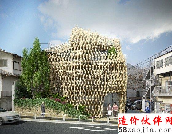 日本的建筑设计师将其设计为60毫米x60毫米的三维网格空间,并与地面呈30度夹角。这样的设计可以让阳光自然的照亮屋子,同时还为客户提供了隐私空间。该地区被日本政府设为4A级景区,随着周围环境的不断改善,该建筑的品质也不断上升,不论是视觉上还是环境上,都是一个温暖的地方。
