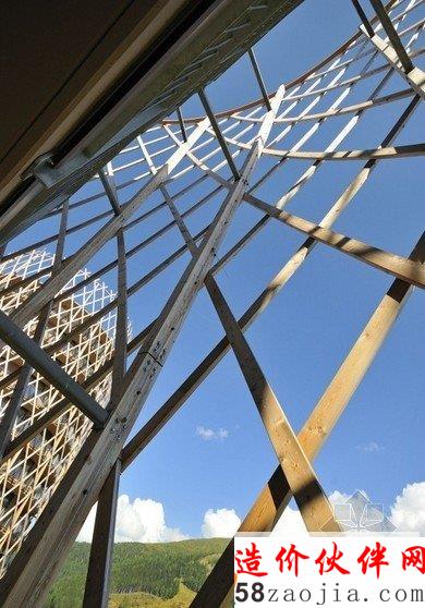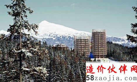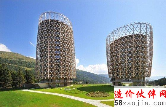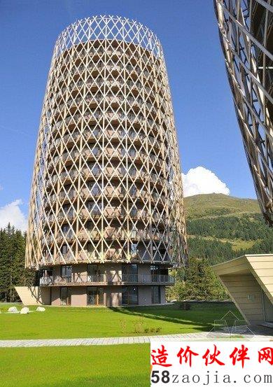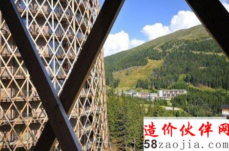 Matteo Thun在传统的奥地利萨尔茨堡州和克恩顿州之间的滑雪胜地,有意识地创造了两个垂直建筑,以此避免持续的城市扩张。设计师还通过减少楼层空间的占地面积,来维持周边的绿地面积,以保护周围的环境。该建筑避免了复杂的基础设施装置,取而代之的是采用了简洁的电力和供水设施,把酒店和公寓连接起来,以此为人们提供必要的服务。该建筑采用了木材作为主要建筑材料,主体是圆柱形结构,由直接的松木作,来融合内部和外部的环境。整个建筑看上去像是一个木制的鸟巢。两个大楼都是圆柱形的,在地面测量其直径均有20米,包括64间公寓,面积从45-180平方米不等,房间的内部布局相同,且自然大方,外部景观则大相径庭。