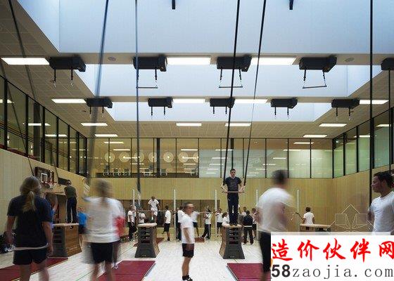 体育学校内部除了基础课堂以为还包括游泳池、室内体育设施以及一个15米高的攀岩墙。其它设施还有一个食堂、多媒体图书馆,体育实验室和一个停车场。建筑屋顶还有一个可以产生电力和暖气的太阳能电池板。建筑外部有树林和大草坪组成的公园。此外,该学校建筑的一面外墙采用玻璃墙的设计,让学员在里面可以观赏到建筑外面的公园和自然景色。建筑内部彩色的墙壁上也被印有骑自行车的运动员图像,体操运动员的图像,曲棍球的运动员,足球运动员的图像的图像等,与鲜艳的背景墙形成强烈的对比和映照。