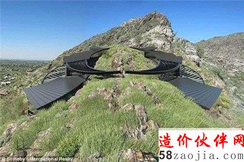 美国亚利桑那州沙漠中部有一栋豪华别墅矗立于山顶,从高空俯瞰该别墅,其外形俨如“蝙蝠侠”标志。该别墅不仅外形奇特,内设也极为讲究,房屋内宽阔的露台可以让房主饱览远处迷人的景致。